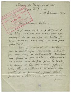 « ...je tiendrais à réveiller par ce petit signe l’aimable intérêt que vous avez si activement témoigné aux épreuves que Madame Klossowska est venue vous confier pour la vente ; cela avait si bien commencé, grâce à votre zèle, maintenant il serait bien gentil, si on pouvait, pour Noël, préparer à Mme K. de nouveau une surprise agréable ! Ne voyez-vous pas le moyen, d’aviver un peu l’intérêt de quelque amateur pour les estampes qui restent à vendre ?... »