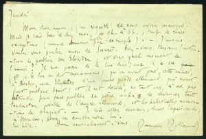 Carte postale autographe signée adressée à Charles Péguy. [Paris, 14 octobre 1904]. Sur entier postal avec adresse autographe Monsieur Charles Péguy aux Cahiers de la Quinzaine – 8 rue de la Sorbonne. Il regrette de l’avoir manqué et souhaite lui parler de Suarès : « …avez-vous toujours l’intention de publier son Elektra, et vers quel moment de l’année ? Il me presse de le lui dire ; car il a su (et je le lui ai dit moi-même) qu’on avait joué, cette année à Berlin, une Elektra d’un jeune poète allemand, qui avait fait quelque bruit ; et il est décidé, en tout cas, à ne pas attendre pour faire publier sa pièce afin de devancer toute traduction possible de l’œuvre allemande, et les habituelles accusations de plagiat... »