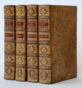 4 vol. in-8, (6)-lxvi-447-(3) pp., lv-1-368 pp., 448-1 pp., 508-1-(3) pp. ; plein veau blond marbré, dos à nerfs orné, pc. de titre et de tomaison de maroquin rouge, trace de fers dorés enlevés au centre des plats, frise dorée sur les coupes, tranches rouge (reliure de l’époque). Belle édition des œuvres de Virgile précédées d’une épitre À Son Altesse sérénissime Constantin Mauro-Cordato, Despote des deux Valachies et de Moldavie. Ouvrage orné de 2 portraits en frontispice dont celui de l’auteur, et illustré d’un frontispice et 17 planches finement gravées en taille-douce par Cochin.