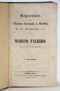 Un vol. in-8, titre, (10) pp. avis de l’éditeur, (12) pp. de dédicace à Frédéric de Prusse, & 112 pp., bandeau, culs de lampe et lettrines gravées sur bois demi-chagrin maroquiné vert, dos lisse (reliure XIXe siècle). Texte relié à la suite du Répertoire du Théâtre français à Berlin, Marino Faliero, 1846. Petite mouillure en marge sur feuillet. Attaque en règle de l’intégrisme religieux.