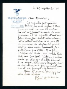 Septembre 1932. « Lorsque j’ai eu le plaisir de vous rencontrer au dîner Maurice Muret, vous avez bien voulu me dire que vous liriez avec bienveillance, en votre qualité d’éditeur, le manuscrit de mon roman Victor et l’étrangère. » Ce roman devant paraitre au Mercure de France, il lui propose de lui remettre les épreuves.