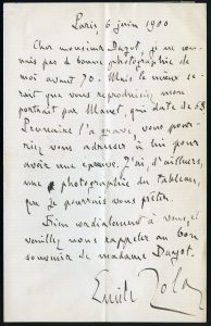 « Je ne connais pas de bonne photographie de moi avant 70. Mais le mieux serait que vous reproduisiez mon portrait par Manet, qui date de 68. Prunaire l’a gravé, vous pourriez vous adresser à lui pour avoir une épreuve. J’ai, d’ailleurs, une photographie du tableau que je pourrais vous prêter… »
