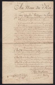 Pièce signée. Versailles, 2 décembre 1781. 1 page in-folio en partie gravée ; petites rousseurs. Ordre à Antoine Bourboulon, Trésorier général de nos Maison, Domaines et finances, demandant de payer comptant le Sr de Sentelles Intendant en survivance de nos fêtes et spectacles la somme de 730 ll 5 s pour supplément aux dépenses faites à l’occasion des spectacles, ballets et quadrilles exécutés par nos ordres les 26 et 27 février dernier...