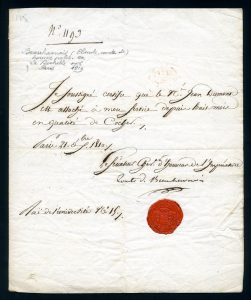 Pièce autographe signée et pièce signée. Paris, 15 novembre 1808 & 21 décembre 1810. 1 page in-12 et 1 page in-4 avec cachet de cire rouge à ses armes. Certificat pour un de ses domestiques qui assurait « quelque fois » l’office de jardinier dans son château en Vendée & certificat pour son cocher.