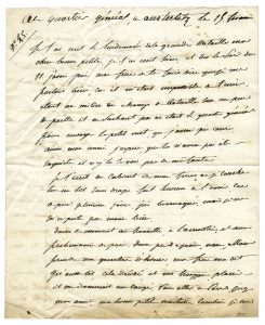 « Je t’ai écrit le lendemain de la grande bataille, ma chère bonne petite… L’Empereur va se rendre à Munich où est l’impératrice, tu sais qu’il est question d’un mariage pour le Pce Eugène avec la fille de l’électeur… La bataille de Memmingen n’était rien à côté de celle d’Austerlitz. Voir cent mille hommes de troupes russes et autrichiennes contre quatre-vingt mille français dans une plaine immense se battre de position en position…depuis le commencement à 7 heures du matin jusqu’à six heures du soir où l’ennemi fut culbuté dans des marais et dans un lac où il y a eu plus de mille hommes noyés, 400 chevaux et 64 pièces de canons…le champ de bataille immense couvert de morts et de blessés qui n’avaient pas été encore enlevés. Nous comptions pour dix russes un seul français….