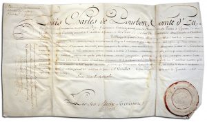 Pièce signée. A Versailles, 25 janvier 1741. 1 page in-folio oblong sur vélin, grand cachet de cire sous papier. Commission de commissaire ordinaire de l’Artillerie délivré au Sieur de Goussay.