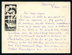 Carte autographe signée adressée à sa sœur. Copenhague, 6 septembre 1930. 2 pp. sur carte in-12 oblong, gravure sur bois du Pourquoi pas ? Sur le chemin du retour après un voyage dans les pays scandinaves