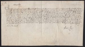 Pièce signée Charles. Vierzon, 4 juin [1434 ou 1435]. 1 page in-4 obl. sur parchemin. Roi pendant près de 40 ans, son destin est indissociable de celui de Jeanne d’Arc. La pièce est contresignée par son notaire et premier secrétaire, Jean Le Picart (1402-1456). Rare pièce signée de sa main, probablement peu avant la paix d’Arras