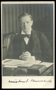 Photographie sur carte postale avec signature autographe (J. Russel & Sons). Un pli dans l'angle inférieur droit affectant une lettre. Signature à l'encre noire, Winston S. Churchill, sur un cliché peu courant, le représentant jeune, à son bureau.