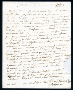 Lettre autographe signée à son épouse. Villa-Major au siège de Sarragoce, 31 janvier 1809. 1 page bi-feuillet in-4, adresse au verso, cachet de cire rouge, marque de franchise « Arm. Française en Espagne ». Il la prévient qu’il a donné sa procuration au beau-frère du général Beker, demeurant à Strasbourg, pour toucher ses revenus du domaine de Westphalie, « et te payer par an 1500 francs. Quand tu auras reçu mes premières lettres, fais moi le plaisir de me faire savoir pour que je puisse être au courant de mes affaires... Nous sommes toujours au siège de Saragosse. Le maréchal Lannes commande en chef le 3e et le 5e Corps. Les Espagnols se défendent avec opiniâtreté. Palafox qui en est le commandant, ayant été sommé de se rendre, a répondu qu’il saura suivre l’exemple de Sagonte et Stativa (présentement San Philippe). Tous nos courriers sont interceptés, assassinés ou fusillés... »