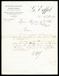 Lettre signée à Alexandrine de la Fère. [Levallois-Perret], 12 juillet 1888. 1 page in-4, à l'en-tête imprimé de G. Eiffel – Constructions Métalliques & Entreprise générale de Travaux Publics. Un mot autographe. Envoi d’un mandat postal pour son volume Ombre et Lumière.