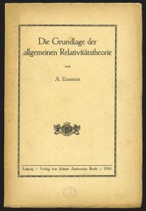 Die Grundlage der allgemeinen Relativitätstheorie. Leipzig, Verlag von Johann Ambrosius Barth, 1916. « Druck von Metzger & Wittig in Leipzig » au verso du titre, et « Metzger & Wittig, Leipzig » au dos de la couverture. In-8, 64 pp. Édition originale.