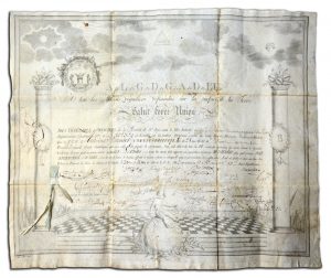 Pièce signée des membres de la loge. Paris, 10 messidor An 10 [29 juin 1802]. Grand vélin oblong en partie imprimé avec décors gravés en encadrement aux attributs maçonniques ; plis, ruban de soie bleue et blanche. Diplôme maçonnique de l’Union, délivré à un frère ayant passé son dernier grade symbolique à la Loge St-Alphonse des Amis parfaits de la Vertu.