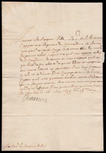 Lettre signée Chrestienne adressée à Monsieur le Marquis Ville, 16 may 1640. ½ p. in-folio, au verso, adresse et cachet de cire noire. « …nous ayant demandé congé de se retirer chez luy nous le luy avons refusé… »