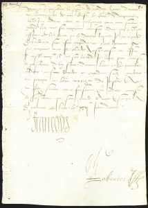 Lettre signée adressée au Premier Président Jean de Selve. St-Germain-en-Laye, 23 avril [1523]. 1 page in-folio, adresse au verso. Le Roi demande de faire recevoir au plutôt en audience le « Seigneur de Merdilly homme d’armes en la compagnie de mon cousin le conte de Dampmartin lequel j’ay ordonné aller quelquepart pour mon service avecques ledit conte son cappitaine… »