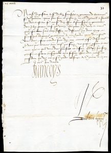 Lettre signée adressée au Premier Président Jean de Selve. St-Germain-en-Laye, 25 avril [1523]. ½ p. in-folio, adresse au verso. Au sujet du serment que doit prêter devant le parlement le Sieur du Biez « Senneschal et gouverneur de Boullennoys » pour son office.