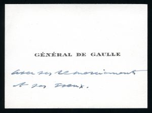 Carte de visite avec compliment autographe. [Paris, janvier 1950]. Carte de visite du « général de Gaulle » ; joint son enveloppe. Remerciements auprès de Melchior-Bonnet, directeur des éditions Arthème-Fayard, pour ses vœux de nouvel an.