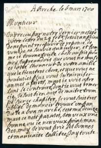 Lettre autographe signée De La Rochette. À Brèche, 6 mars 1700. 5 pp. in-12 Intéressante lettre dans laquelle il passe commande d’un pendule