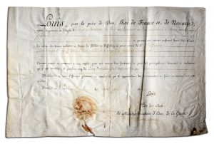 Pièce signée Au château des Tuileries, 17 avril 1821. 1 page in-folio sur vélin, en partie imprimée avec encadrement gravé aux armes royales et croix de la Légion d’Honneur. Brevet de chevalier de la Légion d’Honneur délivré au chef d’escadron Lanthonet, commandant dans un régiment de chasseurs à cheval en septembre 1813, confirmé par Louis XVIII (griffe) et le maréchal Macdonald Grand Chancelier de l’ordre.