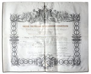 Deux pièces signées Palais des Tuileries, 25 janvier 1854 & 19 septembre 1860. 2 ff. in-folio sur vélin, en partie imprimés avec encadrement gravé aux armes impériales et croix de la Légion d’Honneur. Brevet de chevalier puis d’officier de la Légion d’Honneur délivré au chef d’escadron Louis-Gustave Husson, du Premier Régiment de Chasseurs. Pièce signée (griffe) par l’Empereur Louis-Napoléon et le Grand Chancelier, le duc de plaisance puis le duc de Malakoff.