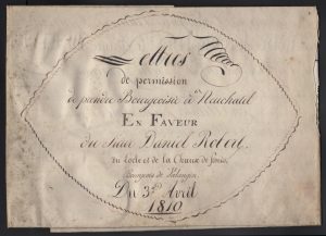 Piéce signée Ch. Godef. de Tribolet. Neufchâtel, 3 avril 1810. Grand vélin oblong, trous au pli avec légère perte de lettres, intitulé au verso. Lettre de bourgeoisie délivrée au nom de Jean-Jacques de Sandoz de Travers président du Conseil et de François Lesperut Gouverneur de la Principauté au nom du Prince de Neufchâtel (Berthier), en faveur de Daniel Robert bourgeois de Valangin, pour résider, s’habituer et prendre droit de bourgeoisie et de communauté en cette ville de Neuchatel…, moyennant 300 livres de droits.