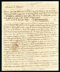 Corbeil, 21 octobre 1809, longue lettre d’un père à son fils lieutenant au 7e de Cuirassiers à l’Armée d’Allemagne, lui demandant de revenir dans sa famille, considérations sur la paix qui vient d’être signée et sur l’empereur Napoléon : « …Je suis père et père d’un fils unique auquel j’ai consacré mon existence toute entière, et à ce titre, j’ai cru pouvoir lui écrire la lettre de cachet ci-dessus... Mon ami, le journal d’avant-hier a annoncé que la paix avait été signée avec l’Empereur d’Autriche le 14 du courant ; celui d’aujourd’hui annonce que la paix a été annoncée publiquement hier aux spectateurs de Paris... Il y a paix jusqu’à la prochaine guerre... » Etc.