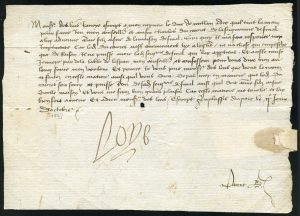Lettre signée Loys adressée à son ami et féal conseiller et chambellan, le Sr Des Lins. Plessis-du-Parc, Tours, 2 octobre [1482]. 1 page petit in-4 obl., contresignée par Pierre Parent, notaire secrétaire du roi et receveur général de ses finances. Le roi ordonne que l’on impose ses vues au duc de Milan, Gian Galeazzo II Sforza