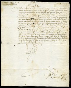 Pièce signée Loys adressée à notre amé et féal conseiller l’arcevesque de Tours [Robert de Lénoncourt (1459-1532)]. Blois, 28 août [1507 ou 1509]. 1 page in-4, adresse au dos, contresignée par Florimond Robertet (1458-1527), secrétaire et trésorier du roi. Petits manques au pli, légère trace de mouillure n’affectant pas la compréhension du texte. Belle lettre évoquant une future naissance royale