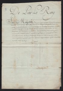 Deux pièces signées (secrétaire) contresignées par Phélyppeaux. À Versailles, 14 janvier 1747. Grand vélin oblong, cachet sous papier. & Versailles, 7 avril 1773. 1 page in-folio. 1747. Retenue pour la charge de sommier de panneterie et échansonnerie bouche auprès de Madame la Dauphine, en faveur de Jean-Baptiste Doucet, en considération de sa bonne conduite et le zèle au service de feue notre fille la Dauphine, le roi demandant au Premier Maitre d’Hôtel de sa Maison de le faire reconnaitre dans ses nouvelles prérogatives.