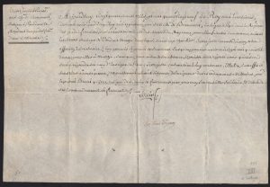 Pièce signée (secrétaire). Versailles, 24 août 1789. Vélin oblong petit in-folio. Congé donné au chevalier sieur de Beaumont « enseigne à pique dans le Régiment des Gardes françaises » pour qu’il puisse se rendre à Malte y faire ses caravanes.