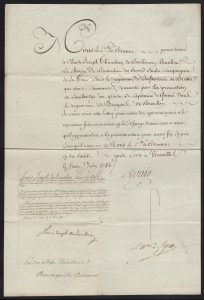 Lettre signée du Roi (secrétaire) et son ministre, le maréchal de SÉGUR. Note signée du prince de Condé et contresignée par son officier secrétaire le comte Boulogne de Lascours.