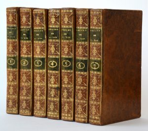 7 vol. in-8, 399 pp. ; 398, (2) pp. ; 412, (2) pp. ; 416 pp. mal chiffrées 406 sans manque, 405, (2) pp. ; 414 pp. ; 416 pp., pleine basane fauve marbrée, dos lisses ornés, pièces de titre et de tomaison de maroquin vert, filet sur les coupes, tranches jaunes (reliure de l’époque). Recueil de tous les discours des députés de la Convention, prononcés lors du procès de Louis XVI, comprenant les rapports des séances, les opinions de chaque député, les interrogatoires, le rapport de l’exécution et le testament de Louis Capet.