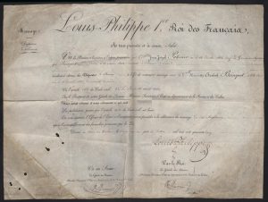 Pièce signée Au Palais des Tuileries, 22 juillet 1845. Grand vélin oblong, en partie imprimée. Dispense d’alliance en faveur du Sr Patissier, veuf de Mme Boinquet décédée en octobre 1844, « à l’effet de contracter mariage avec Dlle Henriette-Elisabeth Boinquet sa belle-sœur… »