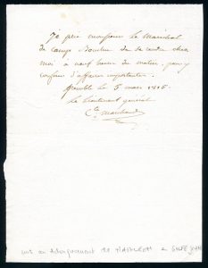 Billet autographe signé. Grenoble, 5 mars 1815. 1 page in-4. Important document suite au débarquement de Napoléon à Golfe-Juan