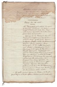 Manuscrit Affaire Demaubreuil – Séances des 10, 17 et 22 avril 2017. S.l.n.d. 1-25 pp. in-folio ; mouillure en haut de page. Récit détaillé des séances du tribunal, déclarations, relations et discours fait publiquement par M. Demaubreuil marquis d’Orvault, aux trois audiences avec plusieurs détails sur son caractère et son aspect physique, remarques sur le public et les différents acteurs du procès
