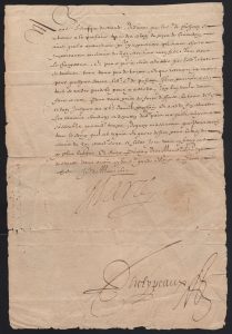 Lettre signée adressée à Charles Rousseau, évêque de Mende. Paris, 10 mars 1612. 1 page in-folio, contresignée par Paul Phelypeaux (1569-1621), secrétaire des commandements de la reine depuis 1610 et secrétaire d’État. Pli renforcé, bord supérieur vierge réduit de deux centimètres environ. Adresse au dos. La Reine régente désire que le sieur de Pichon assiste à la prochaine séance des états du pays du Gévaudan et en informe l’évêque de Mende. Retenant encore son émissaire durant quelques jours, elle demande que l’on reporte au 15 avril le terme des états « …et à cette fin advertir les commis, scindiqz et deputez du dict pais à ce quilz n’ayent à s’assembler que au dict temps… ».