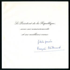 Signature autographe sur une carte de vœux illustrée d’une œuvre de Jacques Poli, fidèle pensée. 20 × 20 cm.