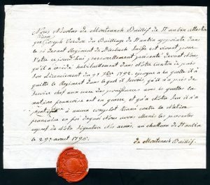 Deux documents. Certificat militaire signé du Sr de Montenach baillif de St-Aubin, pour un soldat du Régiment de Diesbach, licencié en septembre 1792, et qu’il n’a pris aucun service auprès d’une armée avec laquelle la nation française est en guerre ni à aucun complot tramé contre elle (août 1795, 1 page in-8, cachet de cire rouge aux armes. – Pièce signée du comte d’Artois, colonel-général des Suisses, concernant la promotion d’un officier suisse pour le Régiment suisse de Courten, suite à la démission du comte de Salis-Soglio (mai 1820, 1 page in-folio, en-tête gravé de Monsieur).