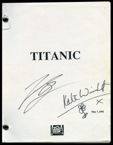 Scénario tapuscrit du film Titanic de James Cameron portant en couverture les signatures autographes de Kate Winslet et Leonardo DiCaprio. 7 may, 1996, logo imprimé de la 20th Century Fox.