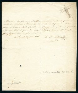 Pièce autographe signée. Paris, 26 juin 1815. Demi-page bi-feuillet in-4 ; coupure au pli, petit trou. Laissez-passer délivré à un messager qui doit se présenter devant Mylord duc de Wellington pour les intérêts les plus essentiels ; document à l’attention des généraux et officiers commandants des premiers postes de l’Armée alliée.