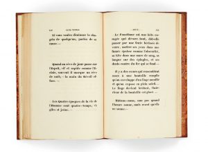 Sur le titre, citation manuscrite extraite des Souvenirs littéraires de Maxime Du Camp: “Cet homme noir dont la place eût été à Charenton se nommait Xavier Forneret. Il donnait des pièces de vin aux directeurs de théâtre pour faire jouer ses drames, était de première force sur le violon, avait une fortune qui lui permettait de publier lui-même ses livres, dormait dans un cerceuil d' ébène et habitait un appartement tendu de velours noir semé de larmes d'argent.”