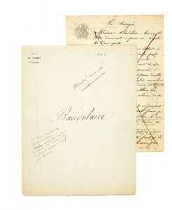 Contrat manuscrit signé “Ch. Baudelaire” et “V. Lecou”, 2 pages in-4, 2 timbres, un humide et un à froid: dans une chemise à en-tête de la Revue de Paris.