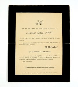 “Monsieur Alfred Jarry, homme de lettres, décédé le 1er novembre 1907, à l' hôpital de la Charité, rue Jacob nº 47” a été inhumé au cimetière de Bagneux. Les obsèques eurent lieu le dimanche 3 novembre en l'église Saint-Sulpice.