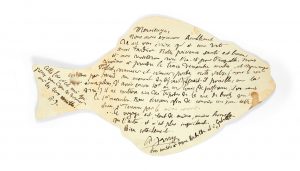 On joint une belle lettre autographe signée d'Alfred Jarry rédigée sur une feuille en forme de poisson, avec l'image d'un poisson doré au recto.