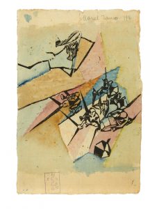 Une des trois épreuves coloriées connues de la première estampe de Marcel Janco: elle a été aquarellée par lui, signée et datée en tête.