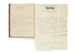 - le manuscrit autographe de 7 pages à l'encre violette offrant un premier jet d'une partie du texte, encore très différent de la version imprimée. Deux dessins au crayon d'Apollinaire figurant des costumes pour la pièce figurent au verso de deux pages.