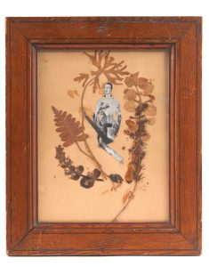 Collage original mêlant photographies découpées et feuilles séchées (230 x 175 mm), sous verre, cadre de bois ciré.