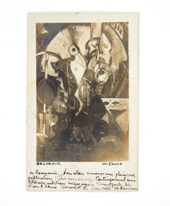 Belle photographie d'un collage de Marcel Janco tirée en carte postale, signée et légendée par l'artiste: “Souvenir.”