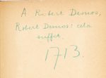 Envoi autographe signé à l'encre verte sur le premier feuillet blanc : A Robert Desnos