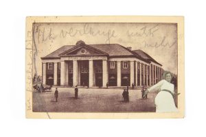Carte postale autographe signée, dont le recto figurant le “Vergnügungspalast Gross-Frankfurt” est orné d'un collage original.